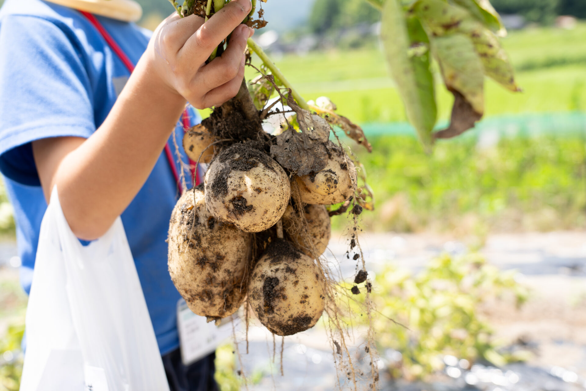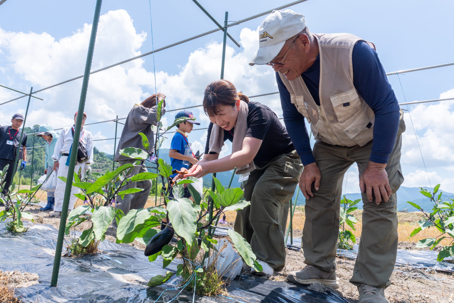突き抜けるような青空と目に鮮やかな緑が広がる加茂町エリア。豊かな清流にも恵まれ、一年を通じて多彩な農業体験ができる”やました農園”で、旬の野菜を収穫しました。参加者は白ナス、千両ナス、長ナス、ジャガイモの収穫に挑戦。ベテラン農家の山下さんに「これが食べ頃じゃで」「付け根のこの辺りを切ってな」と教わりながら、みずみずしい夏野菜を自分の手で採りました。