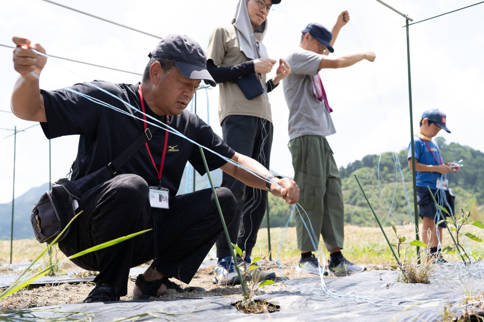 収穫後は長ナスの枝を誘引する紐かけのお手伝い。実がなった時の枝折れを防ぐ大事な作業です。お土産にと昨年の移住ツアーで植え付けた玉ねぎと、トマトやきゅうりまでいただきました。「短時間でも栽培の工夫がたくさん学べました」「収穫も農作業も体験できて、大満足」と心地よい達成感に満たされた時間になりました。