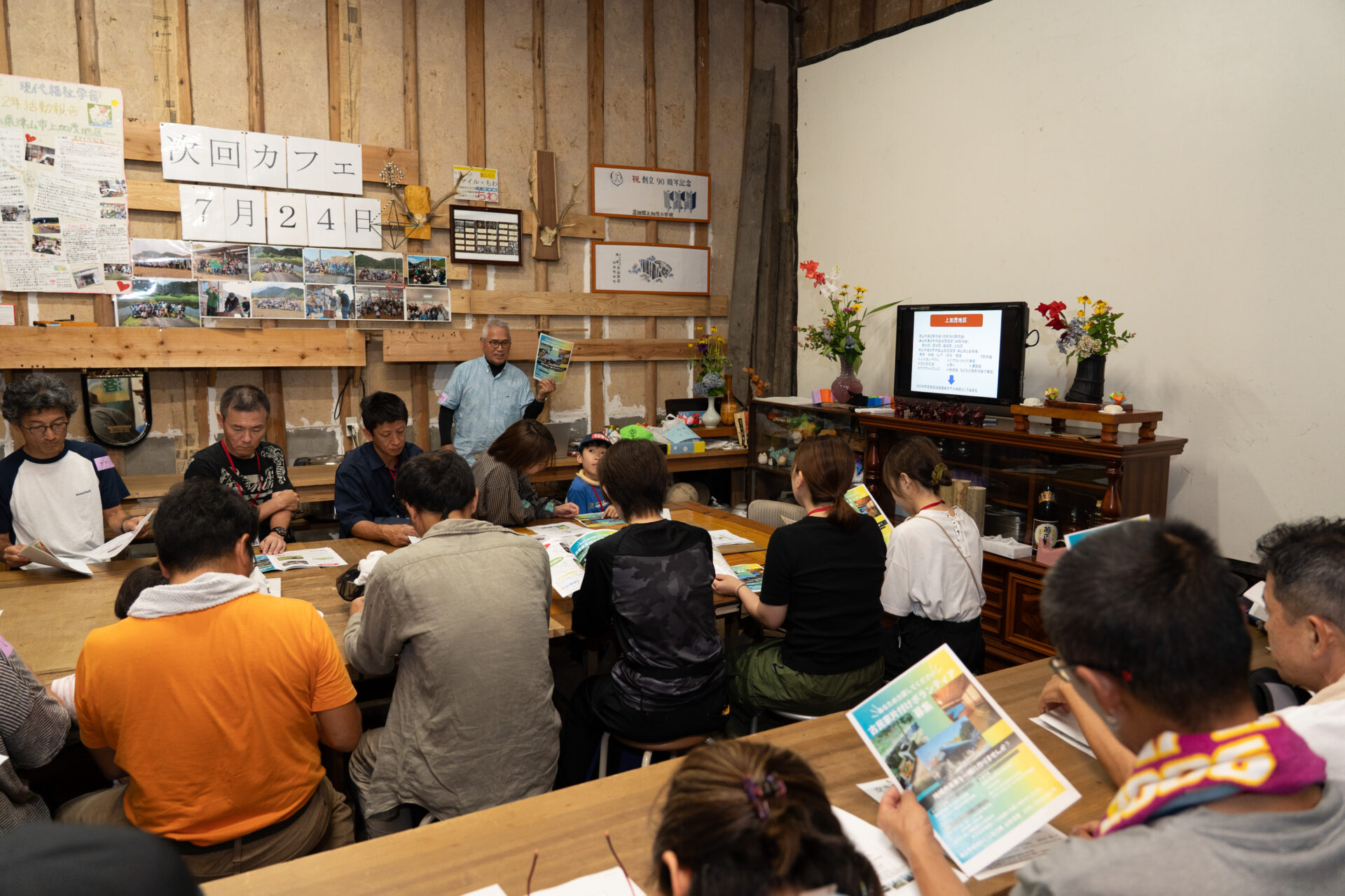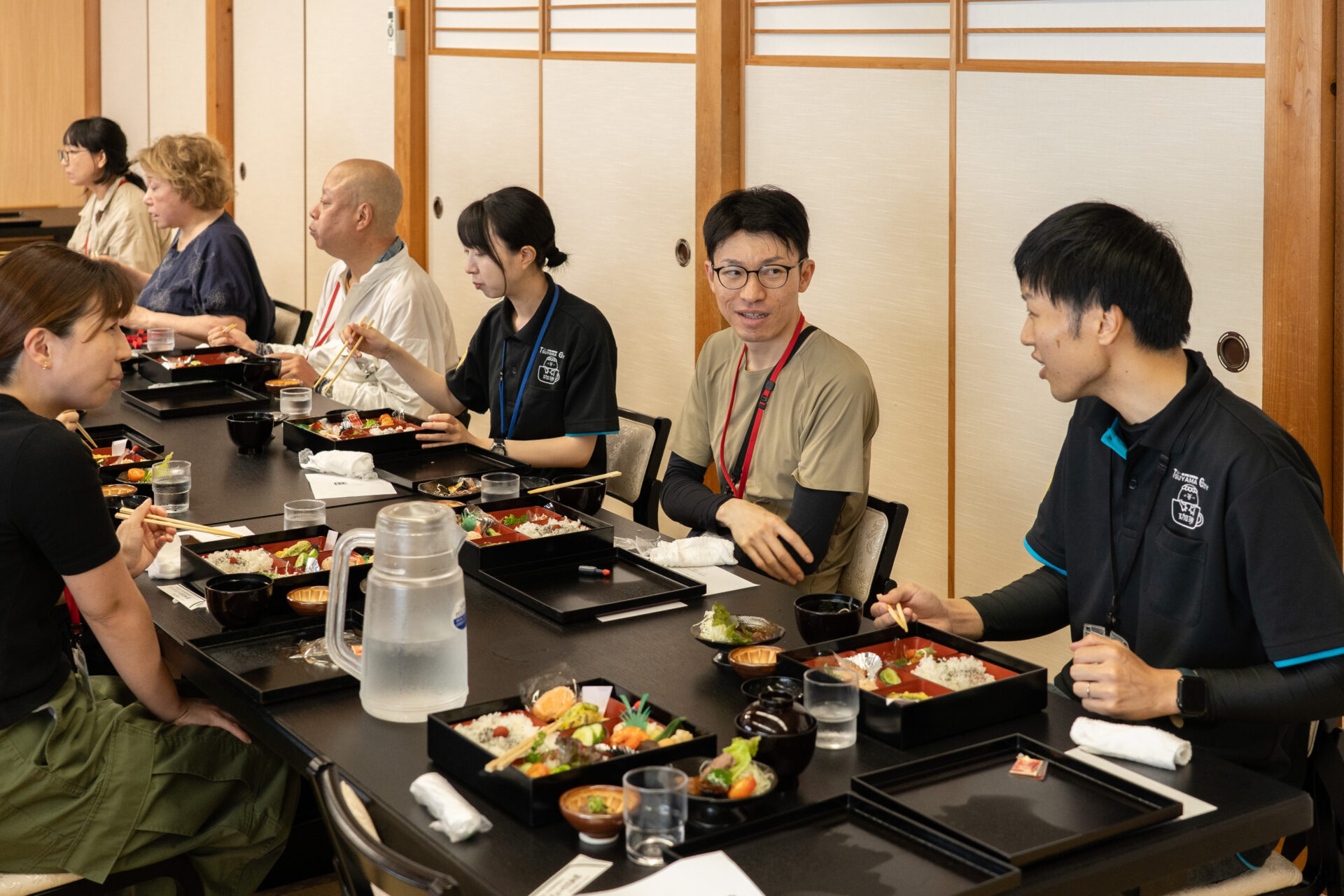 お楽しみのランチタイムには、年間 100 頭も出回らない希少なつやま和牛と噛むほどに肉本来の旨みが口いっぱいに広がる干し肉の小鉢の付いた、特製御膳に舌鼓!加茂町産のコシヒカリもいただいて、参加者にとって忘れられない味となりました。自然と会話も弾み、「移住前の就職活動はどのように進めたら良いですか?」「田舎の人間関係に馴染めるか不安なんです」と参加者の率直な疑問や悩みに、スタッフが一つ一つ丁寧に答えていく場面も。