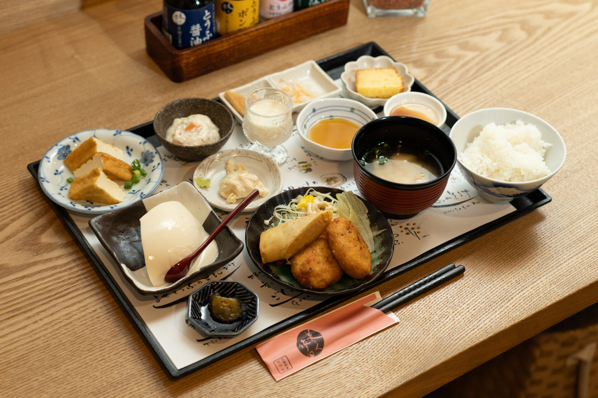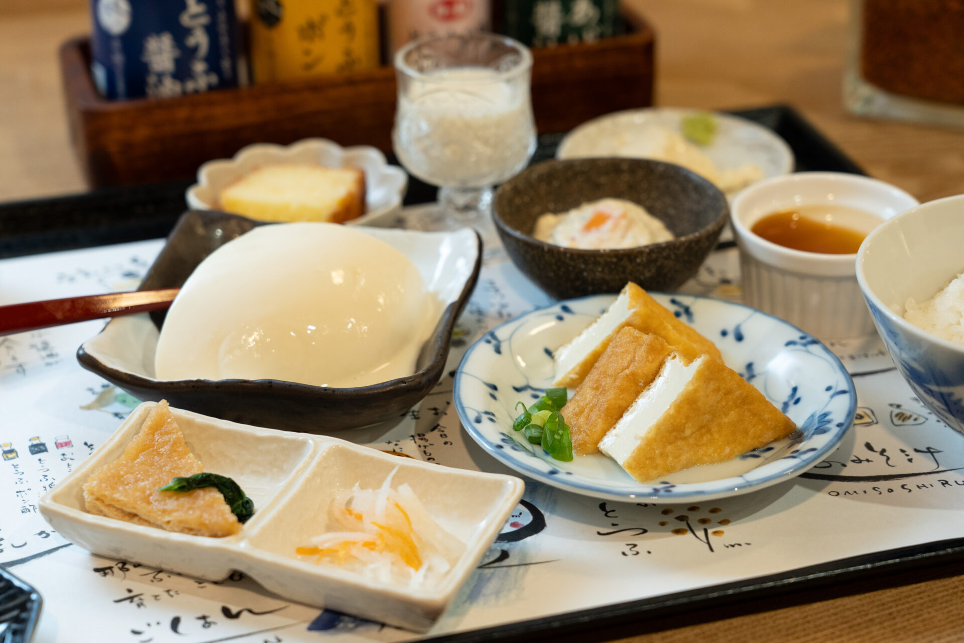 歴史的な美しい街並みが残る城東地区の”早瀬豆富店”で、心も体も満たされるランチタイムを過ごしました。趣ある店内でいただいたのは、美作産大豆をふんだんに使ったお豆腐御膳。濃厚ながらすっきりとした味わいの豆乳から始まり、とろける舌触りの出来たて湯葉、大豆の甘みと深いコクが凝縮されたお豆腐、そしてジューシーな揚げ物と厚揚げまで、大豆の恵みを存分に堪能。お豆腐本来の味を感じられる特製塩や油揚げ専用のお醤油まであり、料理の味をより一層引き立ててくれました。