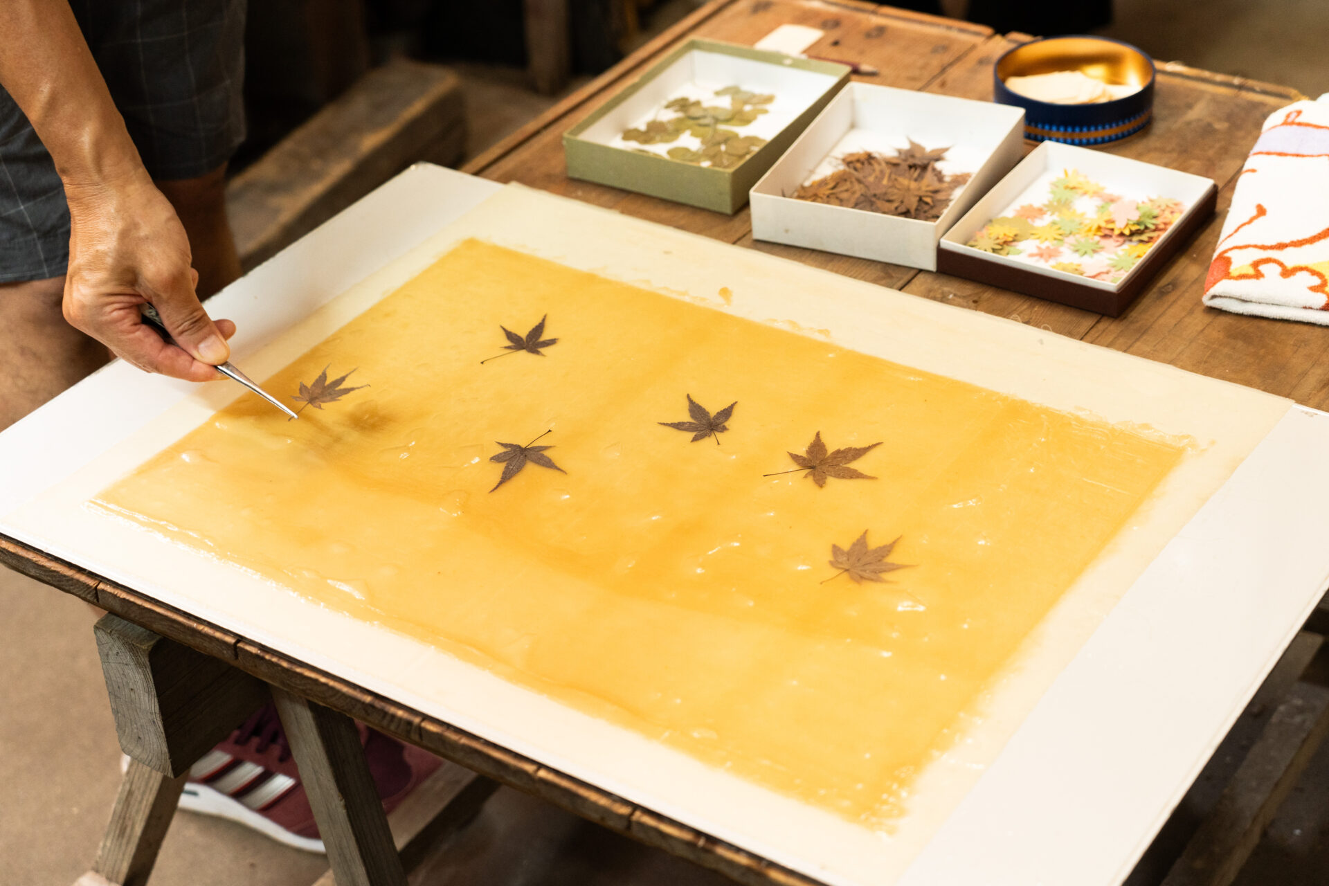 お手本を見た後、それぞれ手漉きに挑戦。「手首の動かし方と、桁を漉き船に入れる角度が重要です」とコツを教わりながらでも、均一な厚さに漉くのは至難の業。「集中しすぎて息が止まってしまいます。本当に神経を使いますね」と手漉きの繊細さを実感した声も。苦労して漉いた自分だけの和紙に飾りをのせて完成。乾燥後に自宅へ届けられます。